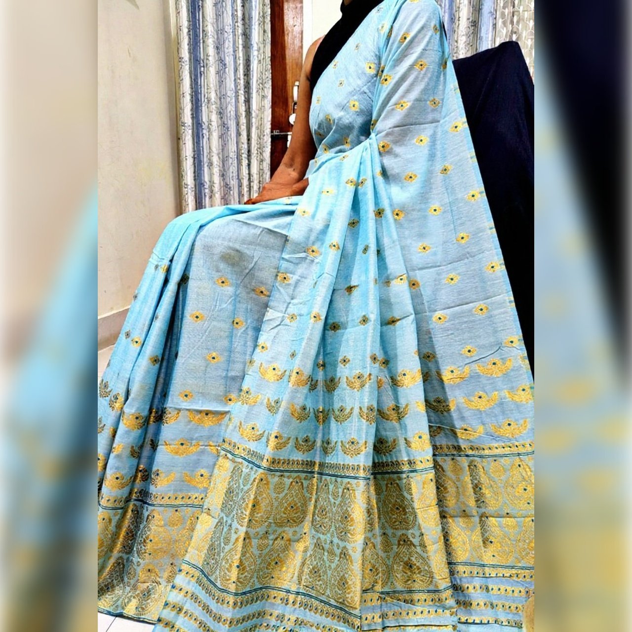 Drape yourself in the timeless elegance of this lavender-hued Muga silk blend saree, adorned with intricate gold zari work. The body features delicate motifs, while the pallu and border showcase elaborate traditional designs, making it perfect for festive occasions, weddings, or cultural gatherings. Experience the rich heritage and luxurious feel of this exquisite piece.