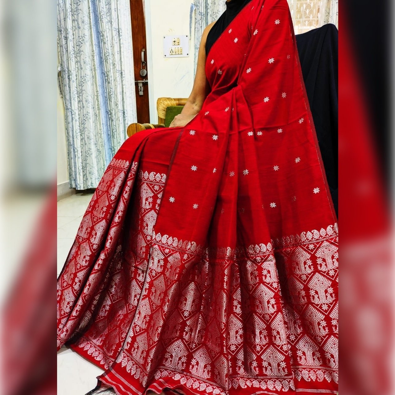 Wrap yourself in elegance with this luxurious red saree crafted from handmade staple cotton. Featuring intricate silver guna work and traditional motifs along the border, this saree is perfect for festive occasions and casual elegance. The fabric is soft, breathable, and designed for all-day comfort.