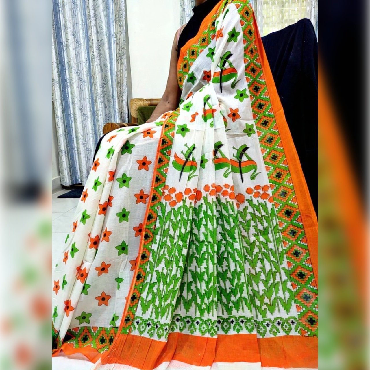 Off-white cotton saree with traditional tribal prints in red and grey. A subtle ethnic look for everyday elegance.